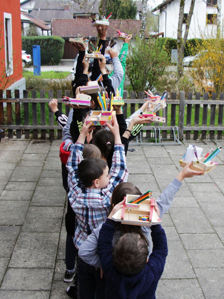 Das war der Höhepunkt der Woche! Der Kreativkurs der Rosenheimer Kunstschule „Kind und Werk“, der für etwa 15 ukrainische Kinder angeboten wurde. Seit ihrer Flucht leben sie in der Gemeinschaftsunterkunft „Kastenauer Hof“ in Rosenheim. Unter pädagogischer Anleitung durften sie hier ihrer Phantasie freien Lauf lassen. Die dabei entstandenen, meist recht praktischen Werke, durften die stolzen Künstler natürlich behalten.